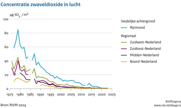 Ongetwijfeld zal de afname van aerosolen in Nederland en West Europa vanaf 1980 bij hebben gedragen aan de toename van de gemeten instraling. Figuur 7 toont die afname sinds 1980 van SO2 in Nederland als gevolg van allerlei maatregelen. De jaargemiddelde SO2-concentraties op regionale achtergrondstations daalden over de afgelopen dertig jaar van 5-15 µg/m3 (met uitschieters naar 30 µg/m3) naar gemiddeld 0,5 µg/m3: de concentraties SO2 op regionale stations zijn sinds 1980 met een factor dertig tot zestig gedaald. Daardoor is in de laatste twee decennia de concentratie SO2 dermate laag dat die waarschijnlijk geen rol van betekenis meer speelt bij aerosolvorming en dus ook niet bij de toegenomen instraling.