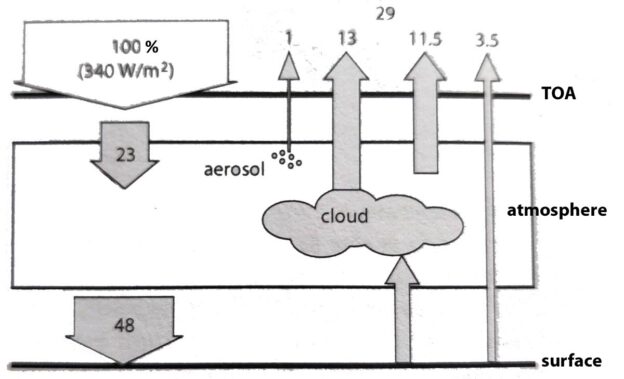 Overigens spelen aerosolen überhaupt een kleine rol in de totale albedo (SW reflectie) van 29% in totaal, zoals figuur 8 laat zien. Slechts 1% (3,4 W/m2) van die 29% (98,6 W/m2) is afkomstig van aerosolen. Dat geldt niet voor wolken, die bijna de helft (13%, 44,2 W/m2) van de totale reflectie voor hun rekening nemen en daardoor een belangrijker factor vormen dan aerosolen.