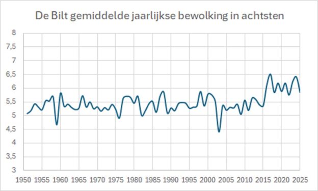 De grafiek van figuur 9 toont de gemiddelde jaarlijkse bewolkingsbedekking op basis van etmaaldata. Er zijn twee breuken te zien, namelijk 2002-2003 en 2015-2017. De eerste breuk was het gevolg van de overstap van visuele naar automatische waarnemingen. De tweede breuk rond 2015–2016 in De Bilt komt vrijwel zeker door de vervanging van de ceilometer (wolkenhoogtemeter) in het meetnet van het KNMI. Die breuken zijn niet gecorrigeerd, daarom is deze tijdreeks ongeschikt  om uitspraken te doen over veranderingen in wolkbedekking.