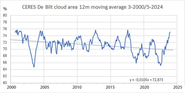 Figuur 10 toont de 12 maands voortschrijdend gemiddelde wolkbedekking. De schommelingen zijn soms groot, zoals in 2002-2003 en 2023-2024. De lineaire trend van -3,1% over de gehele periode van maart 2000 t/m juni 2024 toont een forse afname van de wolkbedekking. Die afname van wolkbedekking moet terug te vinden zijn in de afname van kortgolvige albedo.