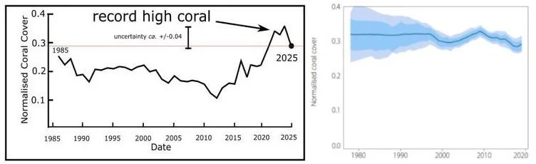 De Australische natuurkundige en vooraanstaande autoriteit op het gebied van koraalriffen, professor Peter Ridd, heeft in een rapport uit 2023 uitgelegd dat de meeste koralen die door hogere temperaturen verbleken, niet afsterven, maar in staat zijn om zich binnen tien jaar of minder snel te herstellen. Dit wordt geïllustreerd door studies van het Australische Great Barrier Reef, dat beschikt over de meest betrouwbare lange-termijngegevens over de koraalbedekking van grote gebieden. Ondanks vier zogenaamd catastrofale verblekingsgebeurtenissen in de zes jaar voorafgaand aan 2022, bereikte de koraalbedekking van het rif in 2024 een recordhoogte, zoals weergegeven in de afbeelding linksonder.