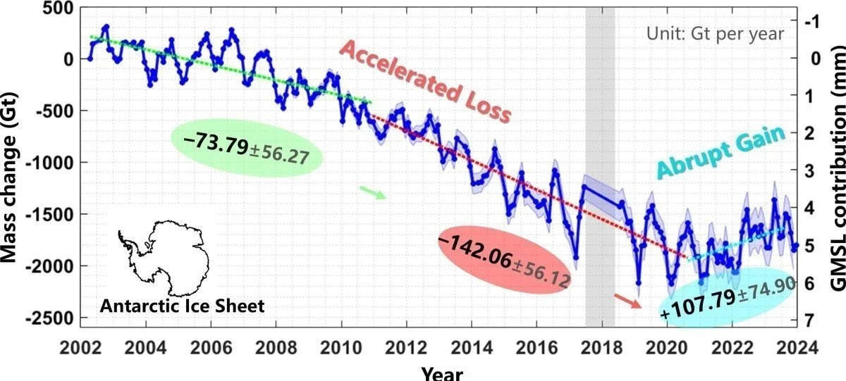 Wat betreft de waarschijnlijke instorting van de West-Antarctische ijskap: er is evenmin bewijs dat een dergelijke catastrofale gebeurtenis op de loer ligt. Zoals ik in een artikel uit 2025 heb besproken, groeit de Antarctische ijskap in zijn geheel en smelt deze voor het eerst in decennia niet langer. Dit wordt geïllustreerd in de onderstaande figuur, die de veranderingen in de massa van de Antarctische ijskap weergeeft van april 2002 tot december 2023, gemeten in miljarden tonnen.