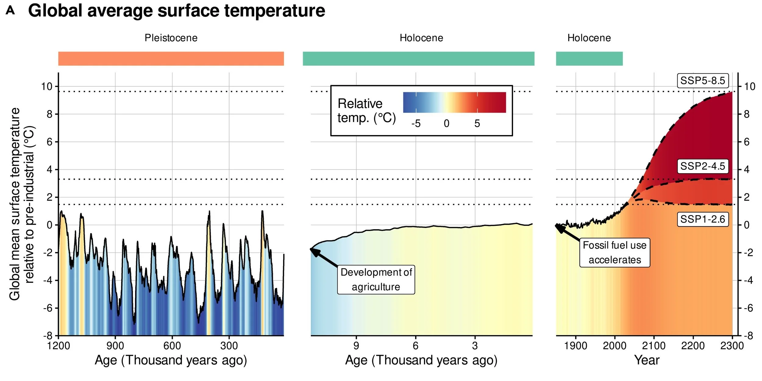 De volgende figuur, uit het nieuwe artikel, geeft de gemiddelde mondiale temperatuur over de afgelopen millennia weer, met toekomstige projecties op basis van zogenaamde SSP’s (Shared Socioeconomic Pathways) die variëren van scenario’s met lage tot hoge emissies. Zoals Roger Pielke Jr. bij vele gelegenheden heeft benadrukt (zie bijvoorbeeld hier), zijn scenario’s met hoge emissies zoals SSP5-8.5, onwaarschijnlijk extreem. Realistischere scenario’s zoals SSP1-2.6 of zelfs SSP2-4.5 zullen in de nabije toekomst slechts een bescheiden opwarming veroorzaken, zonder dat er kans is op het bereiken van omslagpunten.