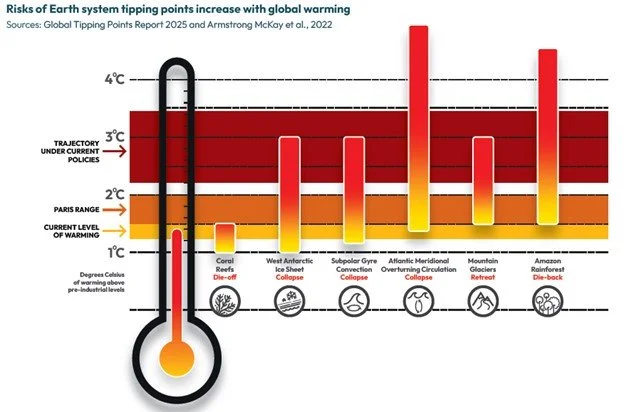 Het rapport van de NGO uit 2025 bevat de volgende samenvatting van vermeende, door de opwarming van de aarde versterkte kantelpunten waarmee onze aarde wordt geconfronteerd. De verticale balken in de onderstaande afbeelding geven het bereik weer van de verwachte temperatuurstijgingen die verschillende omslagpunten zouden activeren. De vermeende nabijheid van de kantelpunten in het rapport komt tot uiting in het feit dat de ondergrenzen van alle balken zich in de huidige opwarmingsband bevinden.