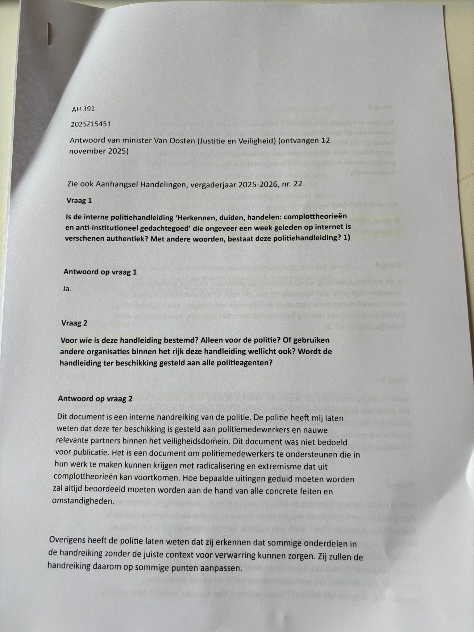 Dan vraag 2: voor wie is deze handleiding bestemd? De minister van Justitie, Van Oosten, antwoordt dat het document een interne handreiking is van de politie. Het is een document om politiemedewerkers te ondersteunen die in hun werk te maken kunnen krijgen met radicalisering en extremisme dat uit complottheorieën kan voortkomen, schrijft de minister, die eraan toevoegt dat de handreiking op sommige punten zal worden aangepast omdat ‘sommige onderdelen in de handreiking zonder de juiste context voor verwarring kunnen zorgen’.