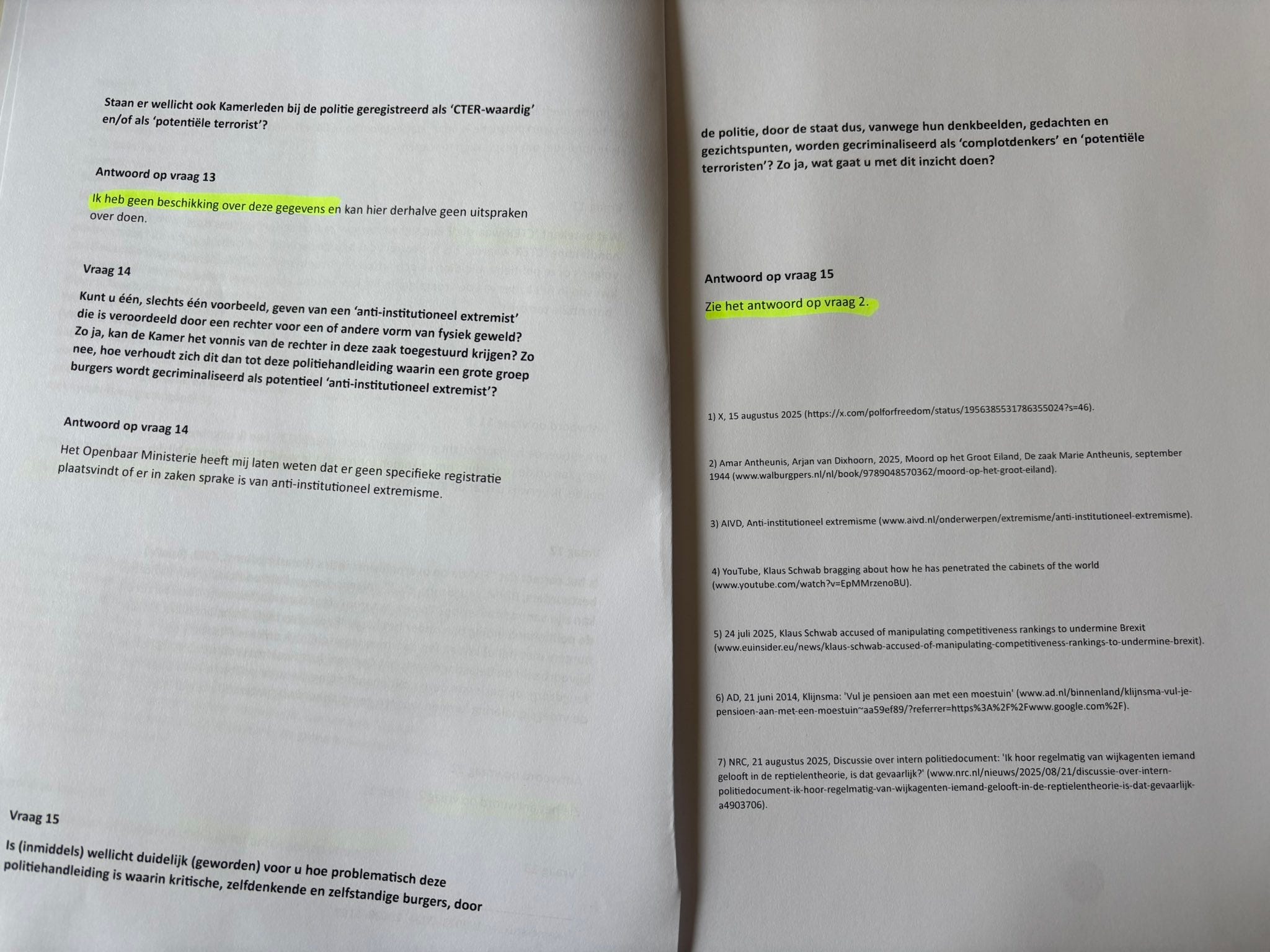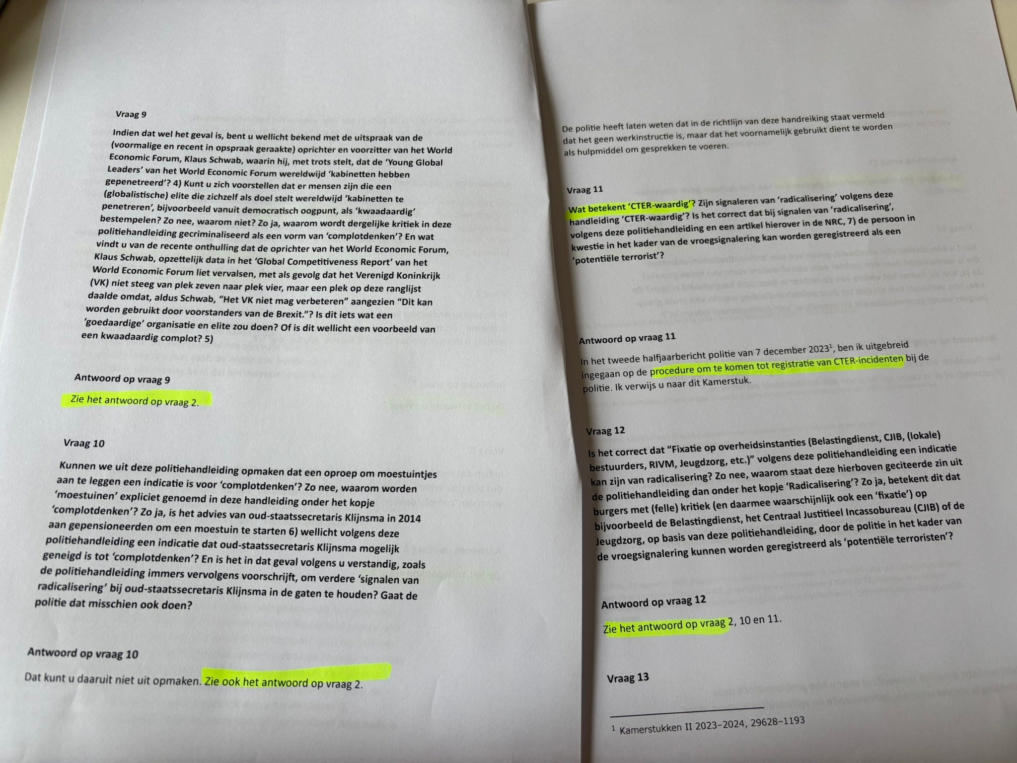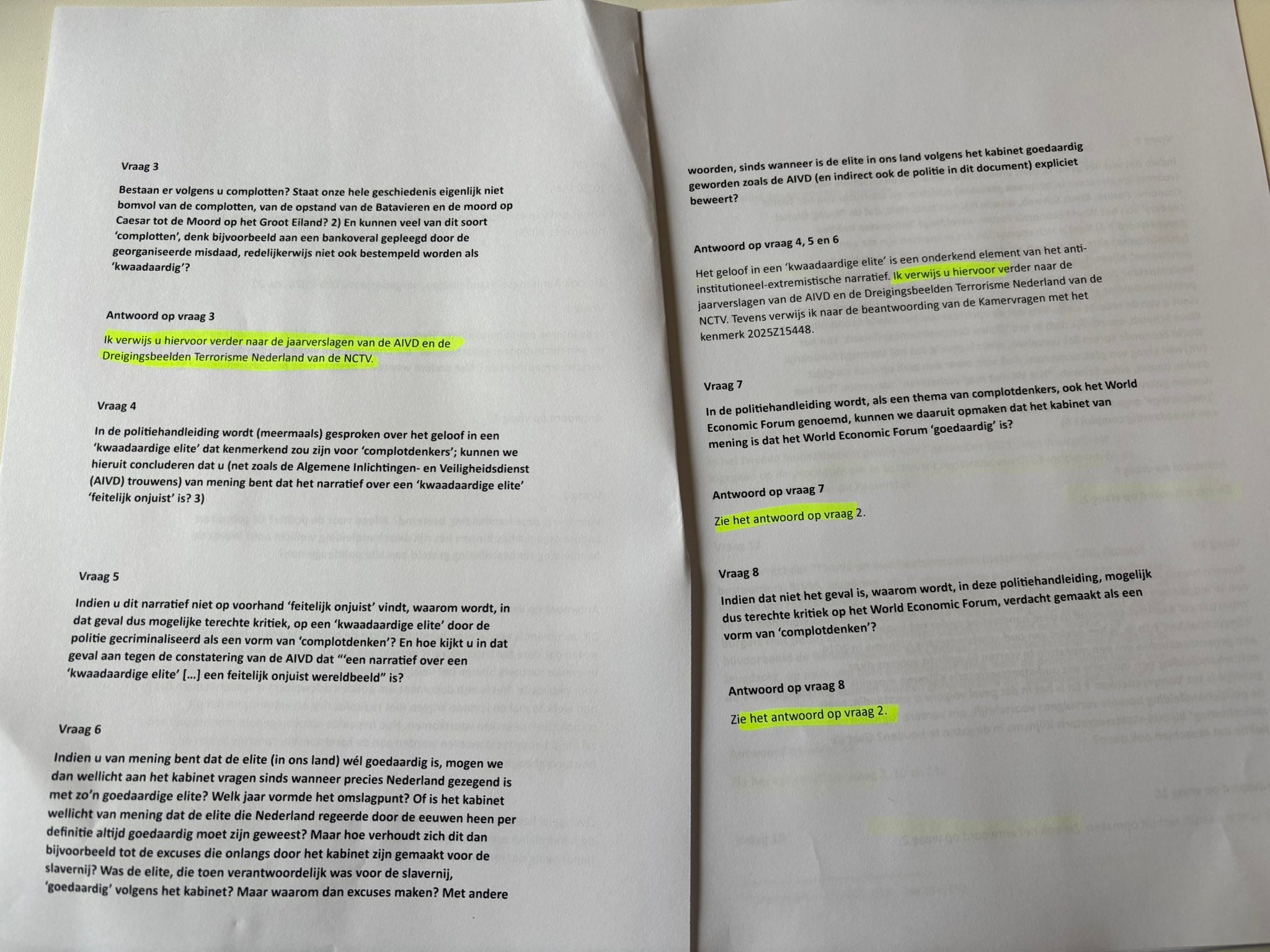 Het kabinet heeft met de grootst mogelijke tegenzin de Kamervragen over de omstreden politiehandleiding over ‘complotdenkers’ beantwoord. Die handleiding had eigenlijk helemaal niet in de openbaarheid moeten komen.