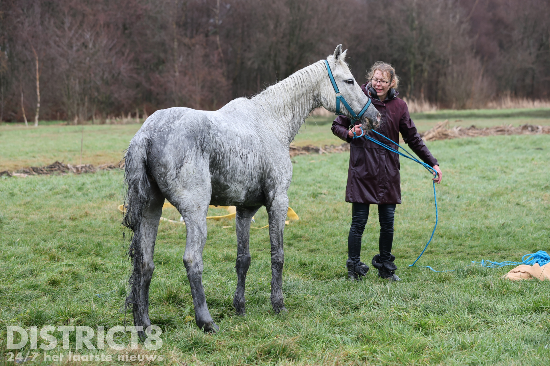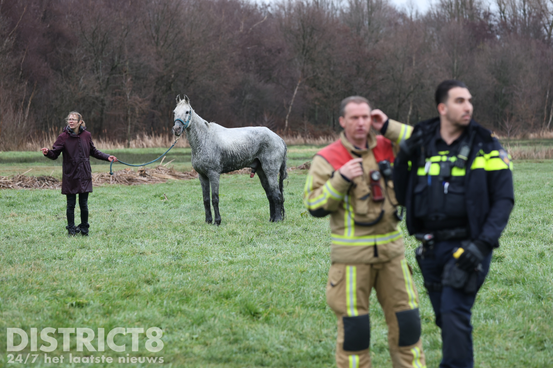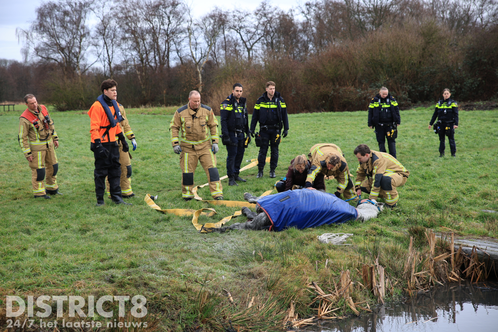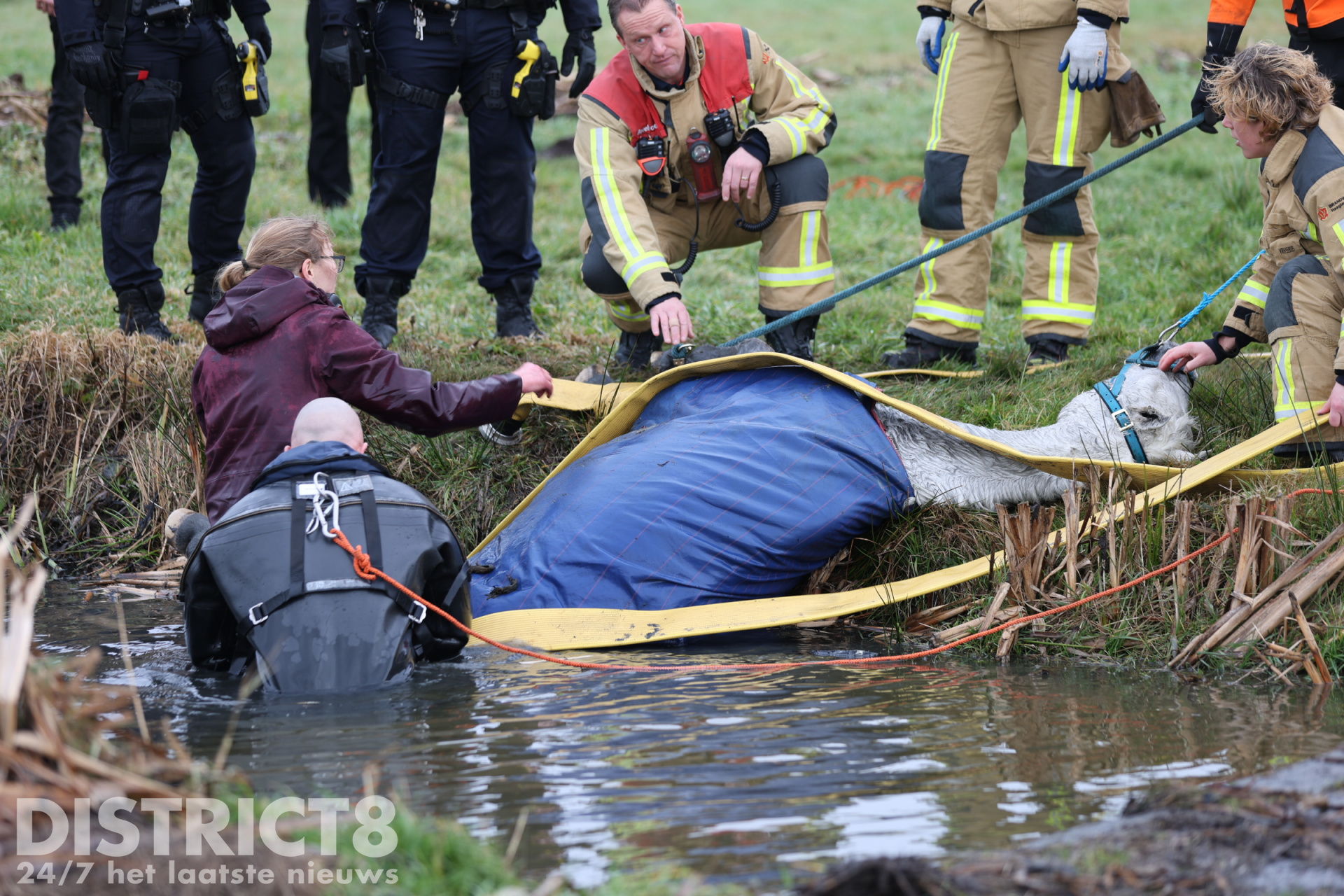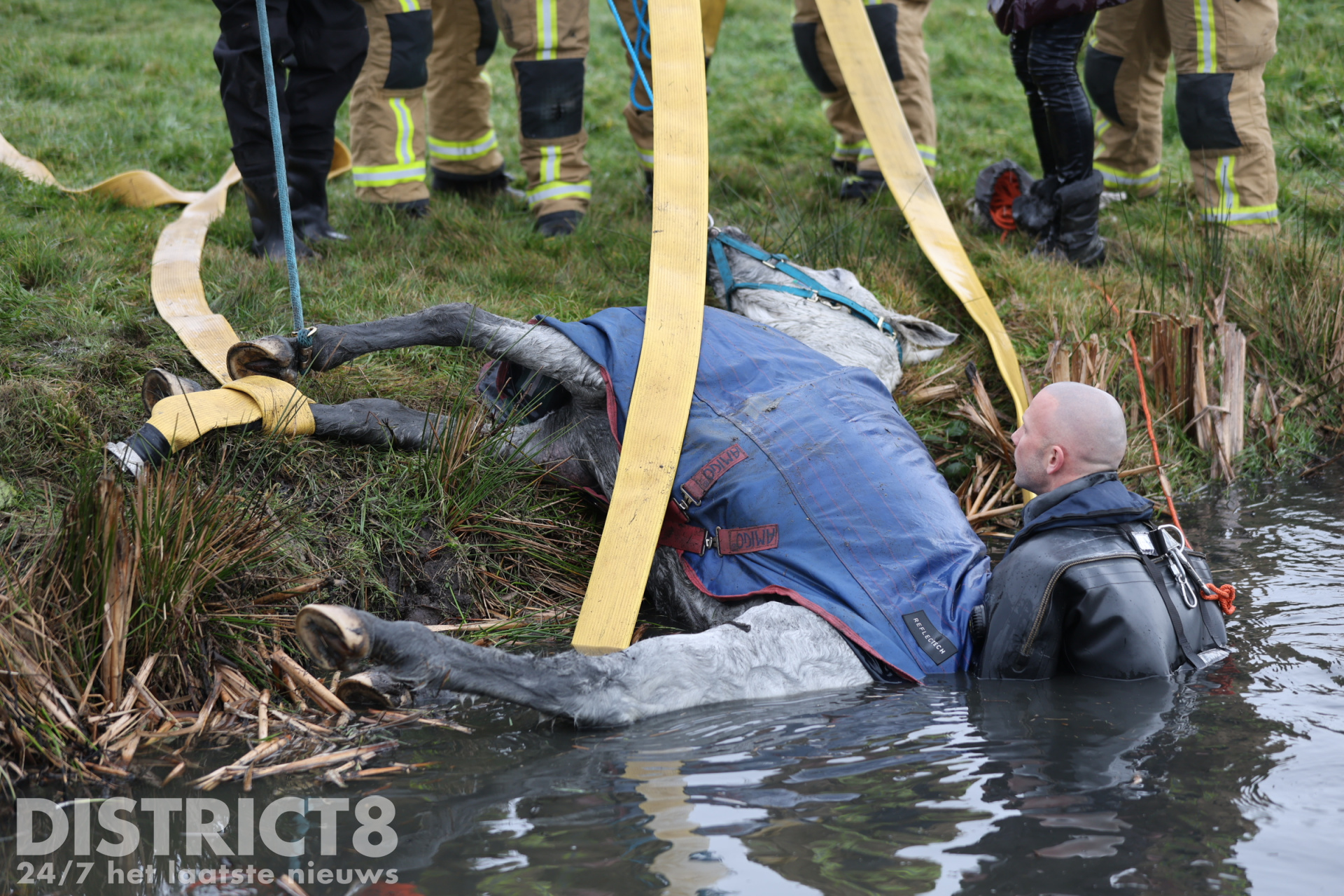 De brandweer heeft het paard met veel kracht en behulp van brandweerslangen uit de sloot getrokken. Het dier had daarna enige moeite met opstaan en lopen, maar loopt inmiddels rond in de wei. De dierenarts wordt verwacht om het paard na te kijken.
