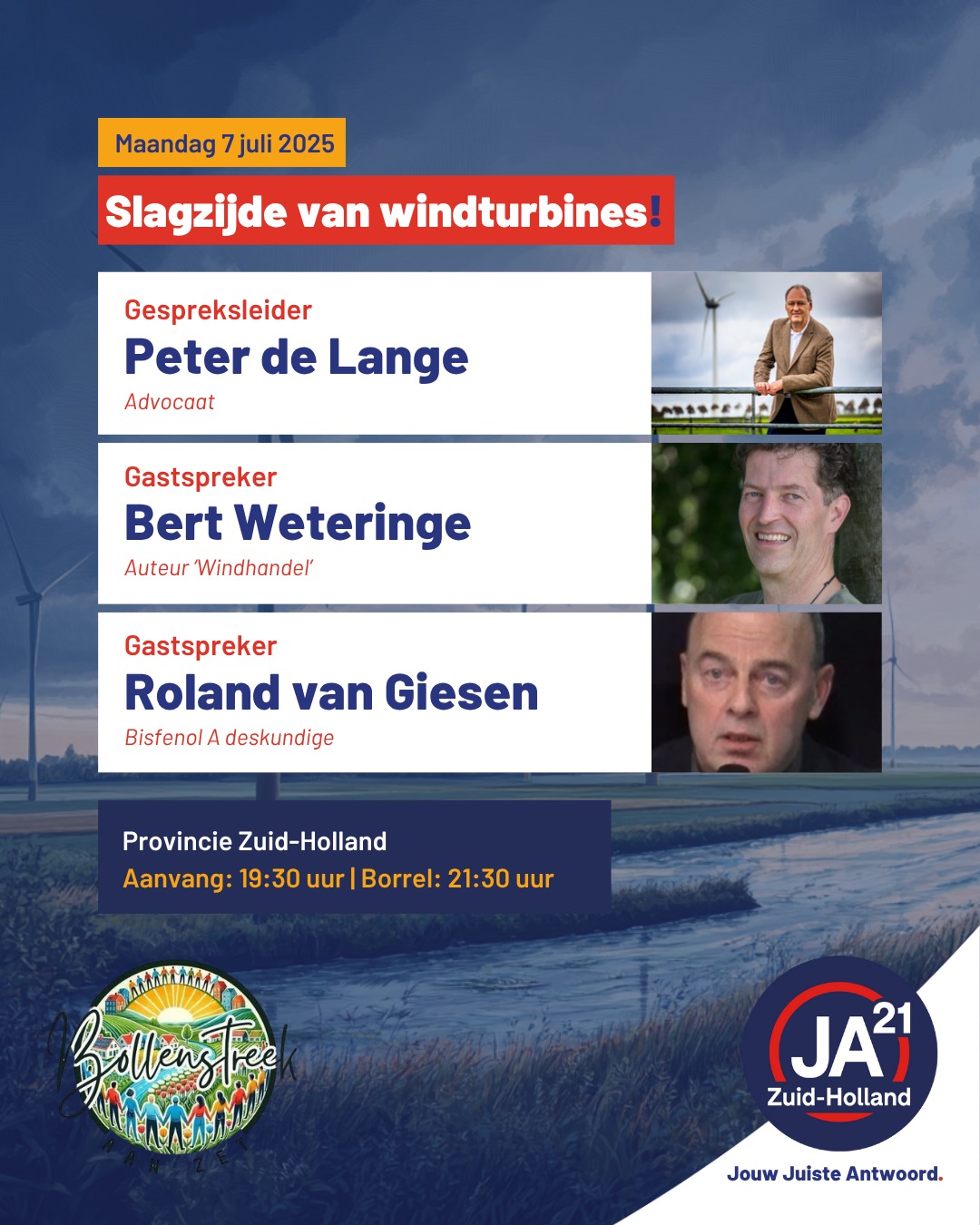 Op verzoek van Statenleden van JA21 heeft Bollenstreek Aan Zet het programma voor deze avond opgesteld en de sprekers uitgenodigd. Tijdens deze bijeenkomst belichten Peter de Lange, Bert Weteringe en Roland van Giesen de impact en keerzijden van windturbines vanuit verschillende invalshoeken.